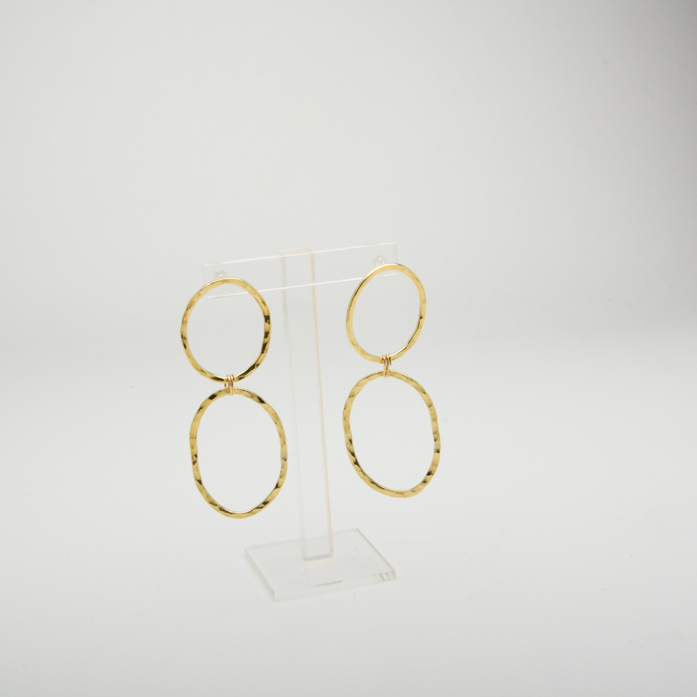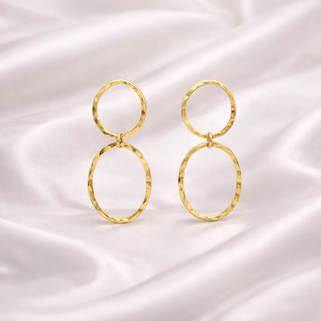 Δύο σφυρηλατημένα οβάλ, όμορφα δεμένα μεταξύ τους, συνθέτουν αυτό το απλό κόσμημα που μπορεί απογειώσει το στυλ σας και να φορεθεί από το πρωί μέχρι το βράδυ για να εντυπωσιάσει. Από επιχρυσωμένο ασήμι 925.